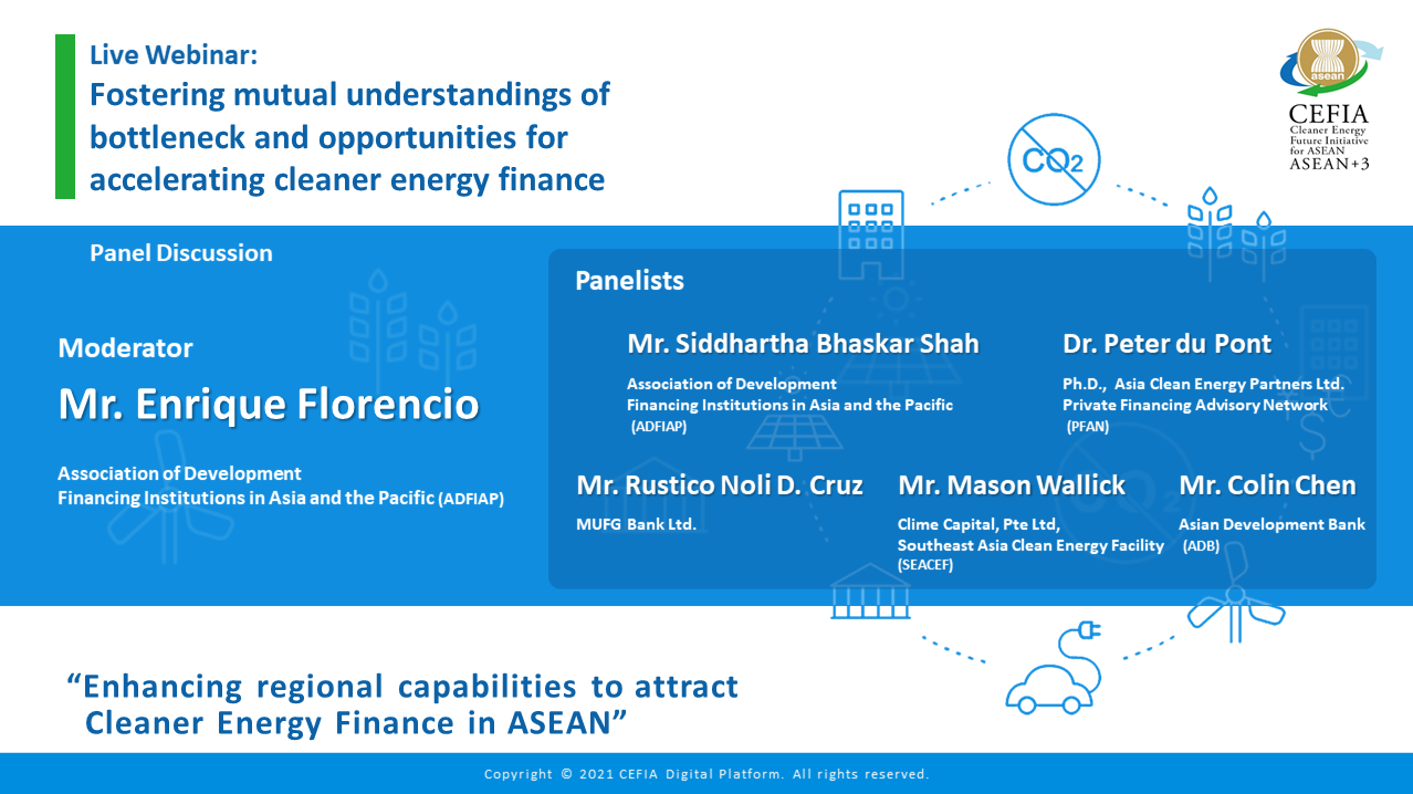 CEFIA aims to develop functions and frameworks that will serve as a platform for mobilizing Cleaner Energy financing to promote the adoption of low-carbon and decarbonized technologies in the ASEAN region. CEFIA has been studying the bottlenecks and enablers of Cleaner Energy Finance and is now planning to develop a roadmap to materialize and implement them. In this session, we will further clarify the expected roles of key stakeholders such as governments, ASEAN local banks, and international development banks, and discuss the capacity building for ASEAN local banks and frameworks and mechanisms to facilitate the mobilization of funds, which are necessary for the CEFIA’s platform to function.