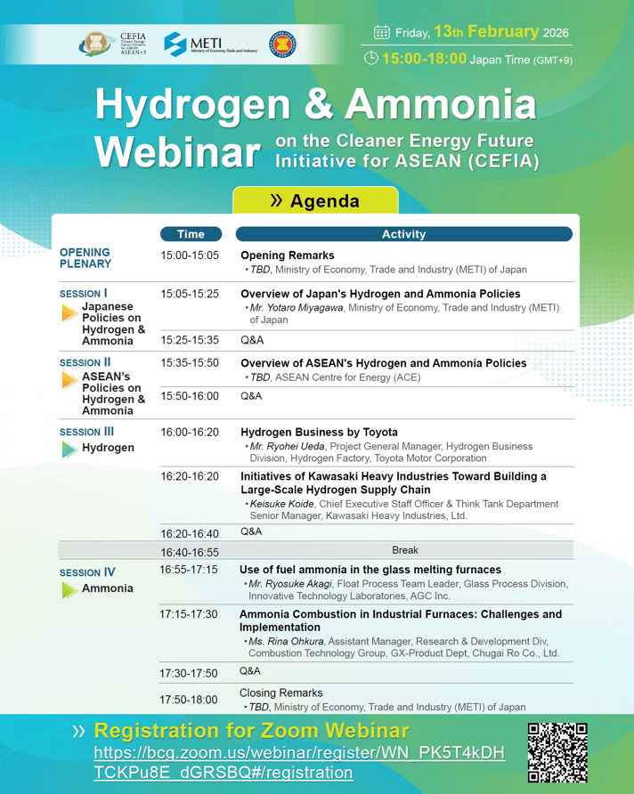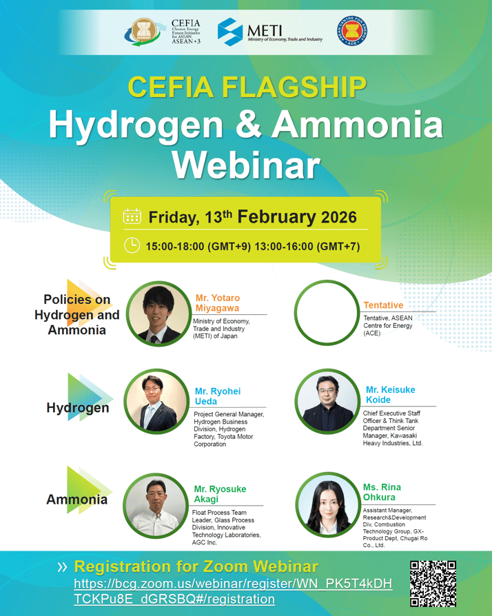 We are pleased to announce that METI, JH2A, CFAA and CEFIA will co-host the CEFIA Hydrogen & Ammonia Webinar, a flagship event to share the latest trends, technologies, and practical cases on Hydrogen & Ammonia, on 13 February 2026 from 15:00 to 18:00 (JST) 13:00 to 16:00 (JKT).