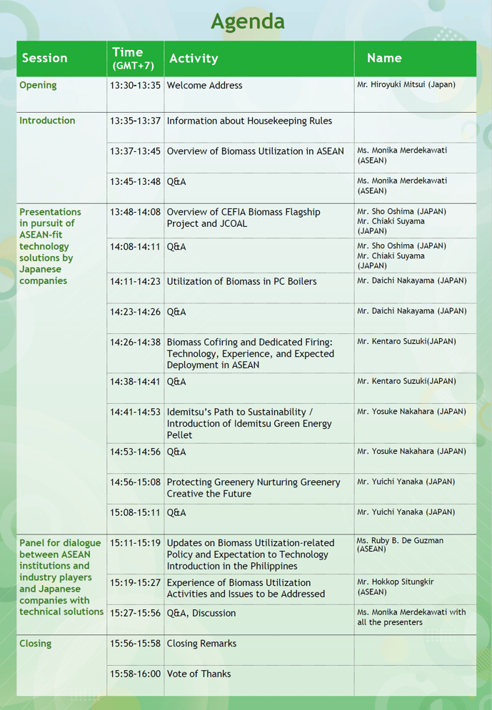 This webinar will bring together government representatives from Japan, Japanese industry players, and ASEAN institutions to share insights on the latest developments in biomass utilization.